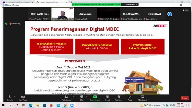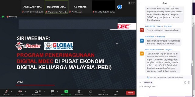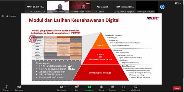 21 Mei 2022 | Aktiviti TerkiniSatu sesi webinar berkaitan program penerimagunaan digital anjuran pihak MDEC telah diadakan kepada semua PEDi yang telah mendaftar secara atas talian. Webinar ini telah diadakan pada 19 Mei 2022 bersamaan hari khamis. Seramai lebih 90 peserta yang terdiri daripada Pengurus PEDi seluruh Malaysia telah menghadiri taklimat yang diadakan menggunakan platform Zoom. Antara pengisian yang dipaparkan oleh pihak MDEC ialah berkaitan program eUsahawan dan PeDAS, keushawanan digital, ekonomi perkongsian, Warongku dan Pos Malaysia. Kesemua paparan yang dipaparkan adalah berkonsepkan digital dan disampaikan oleh pegawai yang terlatih dari agensi masing-masing. Menurut pihak MDEC, sebanyak 30 PEDi terpilih akan dijadikan sebagai pusat penerimaan digital yang dikelolakan di bawah MDEC pada tahun 2022 berbanding 5 pada tahun 2021.