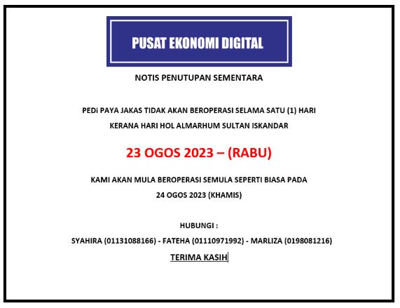 NOTIS PENUTUPAN SEMENTARA SEMPENA CUTI HOL ALMARHUM SULTAN ISKANDAR JOHOR 2023