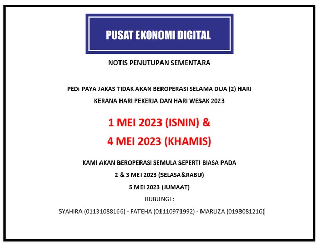 PEDi Paya Jakas akan tutup sementara sempena Hari Pekerja dan Hari Wesak. Maklumat lanjut seperti Rajah dibawah