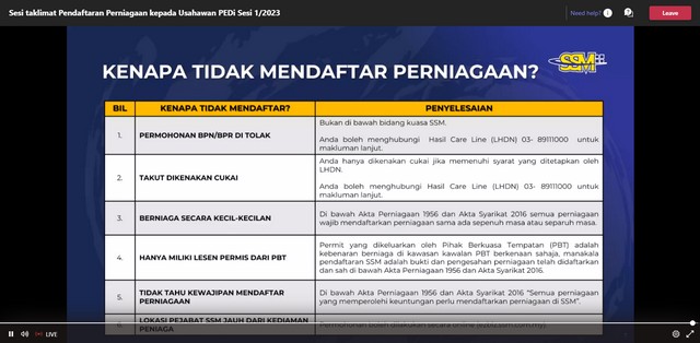 Beliau menjalankan aktiviti perniagaan dengan menjual air susu keluaran Farm Fresh serta beberapa aneka makanan yang lain. Oleh yang demikian, beliau ingin memohon lesen SSM bagi tujuan perniagaannya bagi membolehkan beliau memohon bantuan kerajaan berkaitan keusahawanan khususnya dari pihak TEKUN dan AIM.