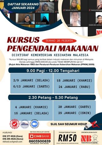 25 Januari 2024 | Aktiviti TerkiniPada 24 Januari 2024, telah berlangsung satu kursus latihan pengendali makanan yang dianjurkan oleh NB Food Specialist Center bertujuan untuk membantu individu yang ingin memohon Lesen Perniagaan, Mereka yang mengendalikan makanan, Mereka yang ingin memohon Status Halal, Mereka yang ingin memohon Tender Kantin. Yang terlibat ialah antara mereka yang Pengusaha , Pemilik / Pekerja / Pelatih Hotel /Resort / Restoran / Kedai Makan /Gerai Makan Kedai Roti / Bakeri / Kek /Kedai Runcit / Pelajar Kulineri Tadika / Taska / Kantin Sekolah / Kilang /Hospital / Berniaga Dirumah/PasarTani /Pasar Malam /Kilang Makanan dan MinumanFood Truck / Peniaga Burger / Peniaga Air / Katering.