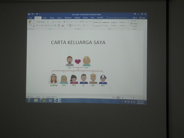 Untuk kelas kali ini pelajar di ajar bagaimana untuk membuat carta dan pelajar juga di berikan aktiviti untuk membuat carta keluarga masing-masing. Kelas di mulakan dengan taklimat KDB berkenaan berkongsi secara berlebihan.Kemudian kelas di teruskan dengan Kelas asas ms word.Kelas diakhiri dengan aktiviti mewarna menggunakan aplikasi paint.