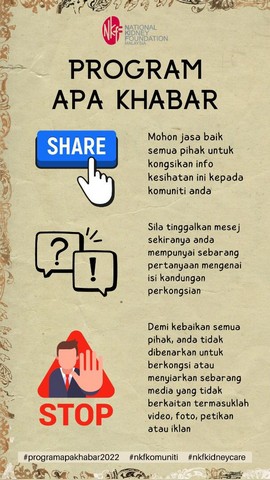 2 Julai 2022 | Aktiviti TerkiniPada 1 Julai 2022, National Kidney Foundation telah menganjurkan program Apa Khabar bertujuan untuk memberikan maklumat mengenai kesihatan dan penjagaan buah pinggang kepada seluruh rakyat Malaysia. Disamping itu juga, National Kidney Foundation ini juga turut turun padang ke lokasi-lokasi yang terpilih agar dapat mendekati dengan rakyat tempatan. Di antara yang terlibat adalah pihak Kementerian Kesihatan Malaysia dan National Kidney Foundation.