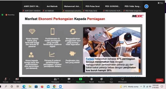 21 Mei 2022 | Aktiviti TerkiniSatu sesi webinar berkaitan program penerimagunaan digital anjuran pihak MDEC telah diadakan kepada semua PEDi yang telah mendaftar secara atas talian. Webinar ini telah diadakan pada 19 Mei 2022 bersamaan hari khamis. Seramai lebih 90 peserta yang terdiri daripada Pengurus PEDi seluruh Malaysia telah menghadiri taklimat yang diadakan menggunakan platform Zoom. Antara pengisian yang dipaparkan oleh pihak MDEC ialah berkaitan program eUsahawan dan PeDAS, keushawanan digital, ekonomi perkongsian, Warongku dan Pos Malaysia. Kesemua paparan yang dipaparkan adalah berkonsepkan digital dan disampaikan oleh pegawai yang terlatih dari agensi masing-masing. Menurut pihak MDEC, sebanyak 30 PEDi terpilih akan dijadikan sebagai pusat penerimaan digital yang dikelolakan di bawah MDEC pada tahun 2022 berbanding 5 pada tahun 2021.