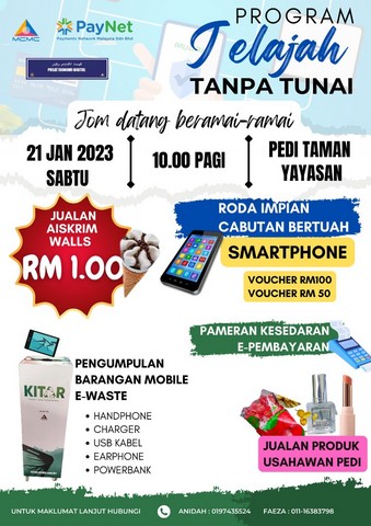 Pada 21 Januari 2023, bertempat di Taman Yayasan Segamat telah berlangsung Program Jelajah Tanpa Tunai bertujuan untuk memudahkan para peniaga dan pembeli membuat bayaran tanpa tunai (cashless). Disamping itu juga, program ini turut mengadakan program KITAR semula dengan mengumpul barangan mobile e-waste sekali gus memberi kesedaran kepada penduduk tempatan untuk pembuangan barangan telefon di tempat yang betul bagi menjamin kelestarian alam sekitar kita. Di antara yang terlibat adalah pihak Pusat Ekonomi Digital (PEDi) Paya Jakas, Pusat Ekonomi Digital (PEDi) Taman Yayasan, ibu bapa dan kanak-kanak.