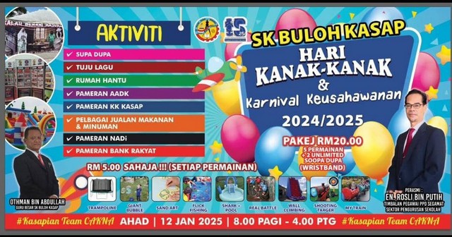 Pada 12 Januari 2025, kami telah melaksanakan program pameran booth NADI di SK Buloh Kasap sempena hari kanak-kanak dan keusahawanan. Program ini merangkumi pelbagai aktiviti yang bermanfaat kepada warga sekolah termasuk: